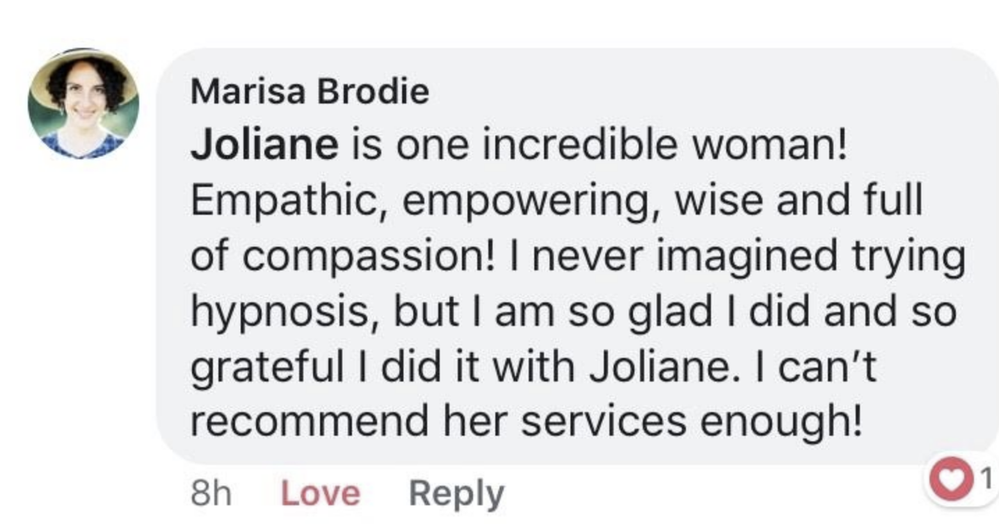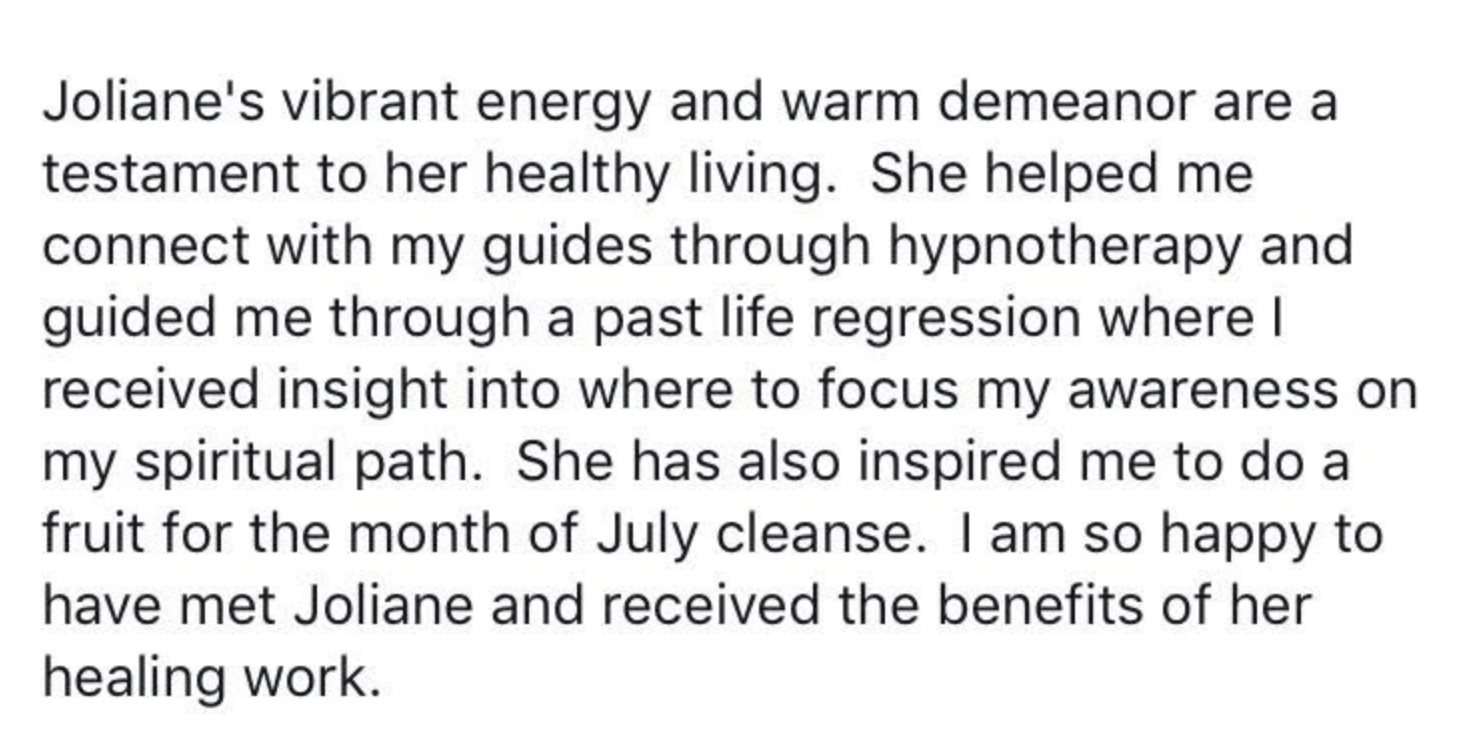 “Joliane helped me kick-start my family’s better eating habits by breaking down the essentials of a healthy living. Between the food tools and resources, and the hypnosis that helped open up areas where I remained emotionally blocked, she was instrumental in helping me become the powerful female leader in my family again.”