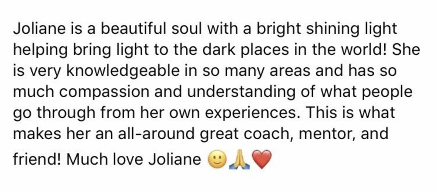 "Joliane is an intuitive, health oriented, life coach.
