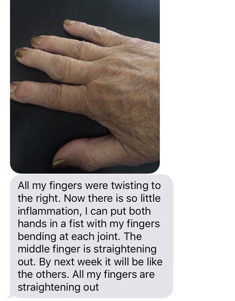 Osteoarthritis: I was diagnosed with osteoarthritis about 20 years ago. However, I never took any of the countless prescribed drugs. I am not sure if I just learned to live with the pain or if the pain actually subsided. At the time of this regenerative detoxification, I would awake with stiff hands and some pain. Since regenerative detoxification, I no longer have stiff hands in the morning, no pain and the inflammation is completely gone.