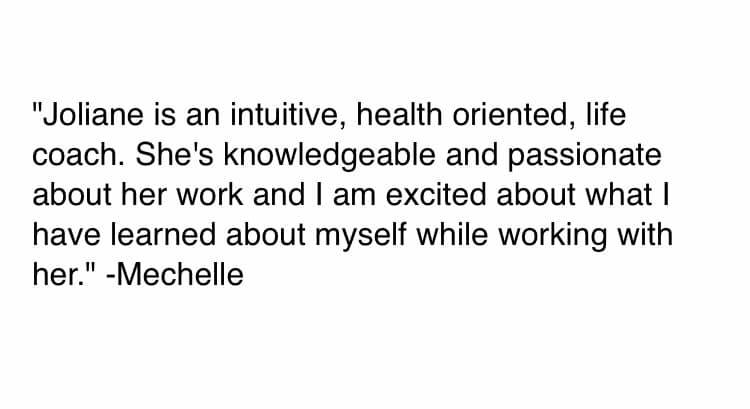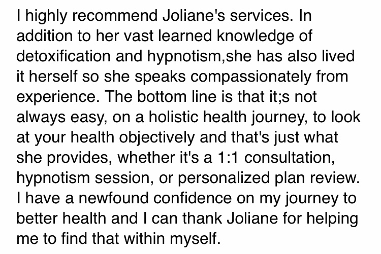 "Working with Joliane was an amazing experience. Her calm and assertive nature was just what I needed to get me on track with my health goals. Not only is she trained as a holistic health coach and hypnosis, she is very intuitive and also has a wealth of knowledge on natural healing. If you are ready to take your health to new levels, I definitely recommend that you work with Joliane. She can take you there."