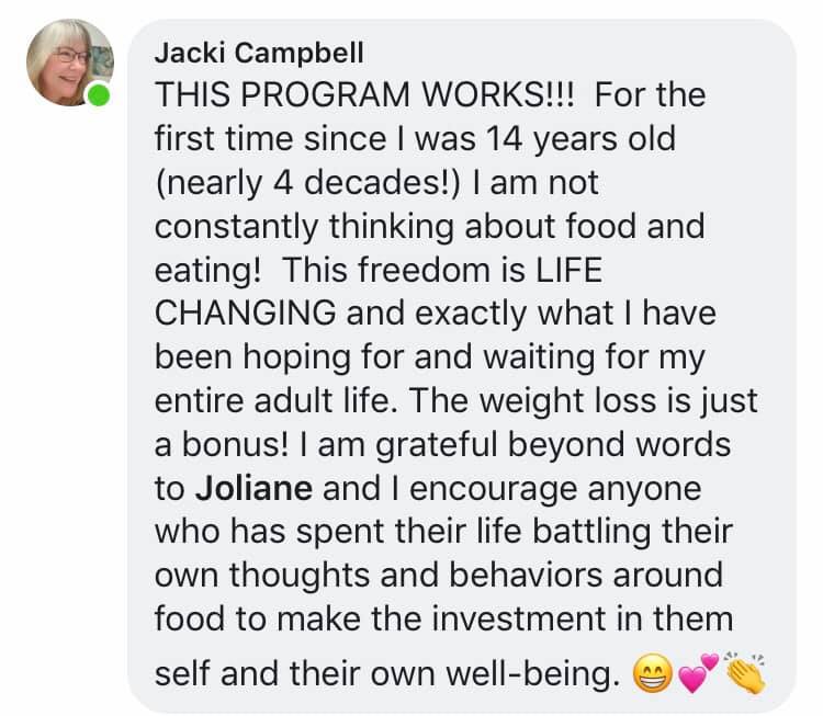 The 12-week course was a journey of healing. Going into it, I had no idea how much I would learn and grow. The subsequent weight loss was just a bonus. I won't say it was easy, but it was definitely worth it! For all of you have tried the typical weight loss routes, with no permanent success, I urge you to contact Joliane!