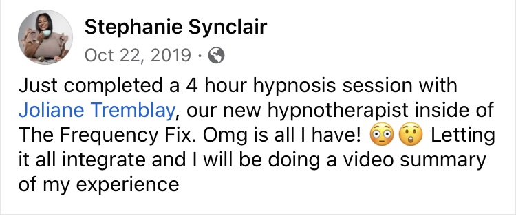 "Joliane is one incredible woman! Empathic, empowering, wise and full of compassion! I never imagined trying hypnosis, but I am so glad I did and so grateful I did it with Joliane. I can't recommend her services enough!
